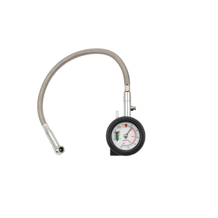 高耐久ステンレスメッシュホース採用。白地に黒の見やすい目盛表示により、正確な空気圧測定が可能です。