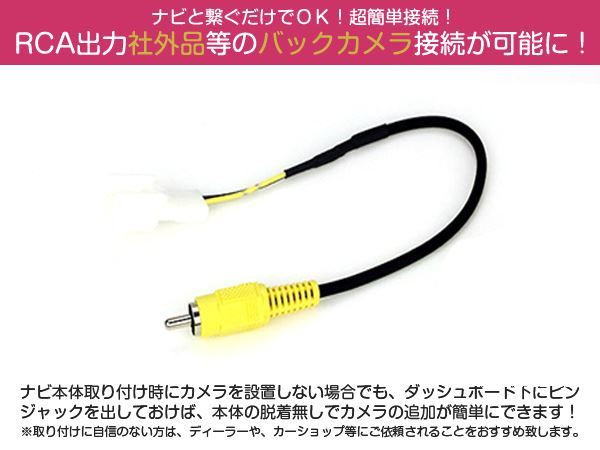 | ■商品説明 バックカメラ専用コネクタに、RCAピン出力のバックカメラを接続する変換コネクタです。 ナビ本体取り付け時にカメラを設置しない場合でも、 この商品でダッシュボードの下にコネクタを出しておけば、 本体の脱着無しでカメラの追加が簡単にできます。 |