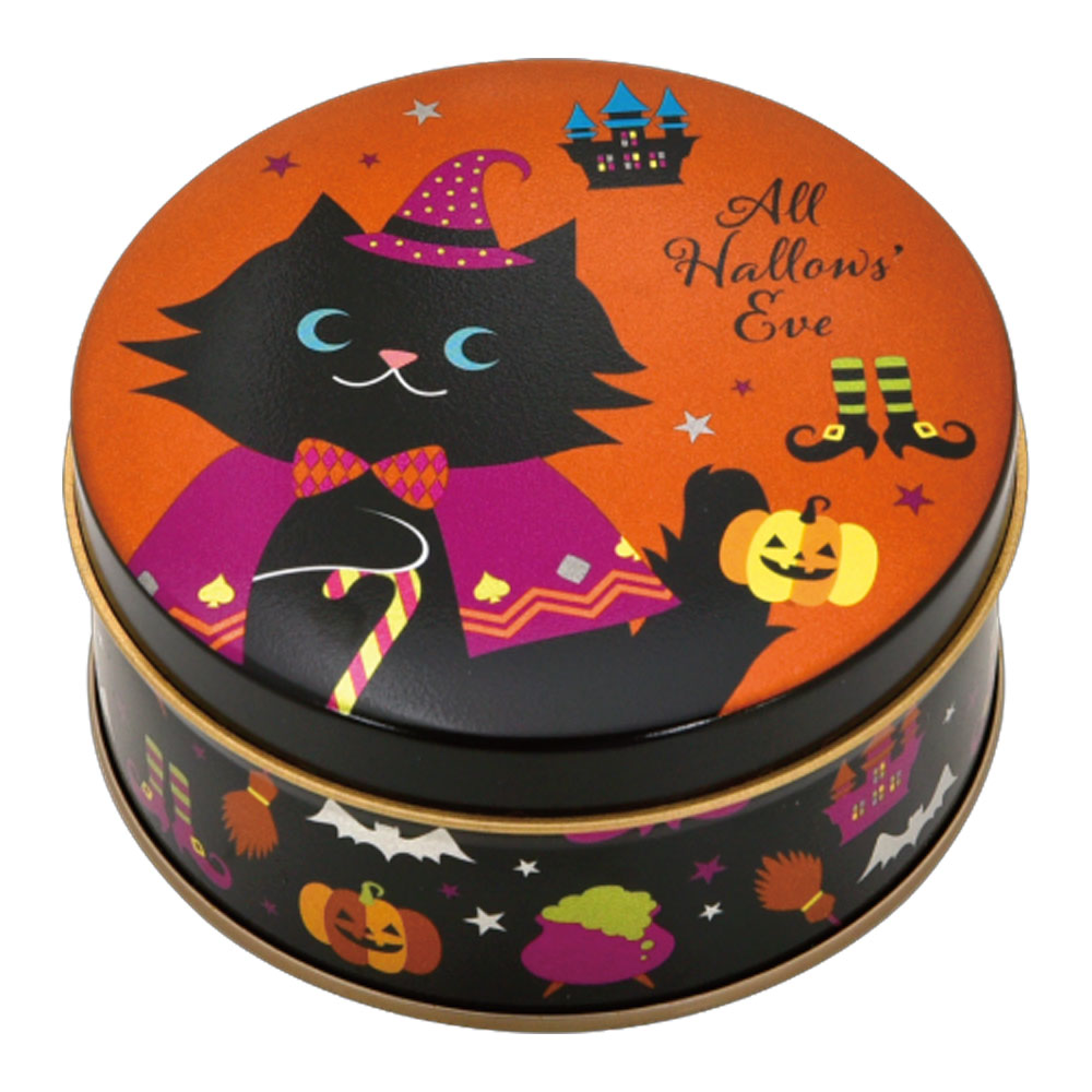 お気に入りの服を着てお城にお出かけする黒猫を缶にデザインしました。バニラ・ストロベリー風味・チョコレートクリームをサンドしたプティーゴーフルが入っています。単品専用バッグも付いてプチギフトにおすすめ!ハロウィンのお菓子と共に楽しいひとときを過ごしませんか。内容量:プティーゴーフル6枚(バニラ・ストロベリー風味・チョコレート/3枚入×2袋)