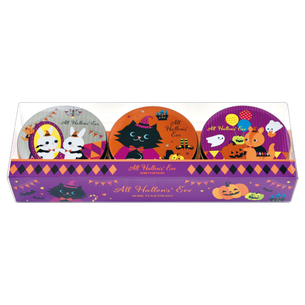 バニラ・ストロベリー風味・チョコレートクリームがお楽しみいただける、『ミニゴーフル ウサギ』『ミニゴーフル ネコ』『ミニゴーフル リス』のセット。ハロウィンのお菓子と共に楽しいひとときを過ごしませんか。内容量: プティーゴーフル18枚(バニラ・ストロベリー風味・チョコレート/3枚入×2袋×3缶)