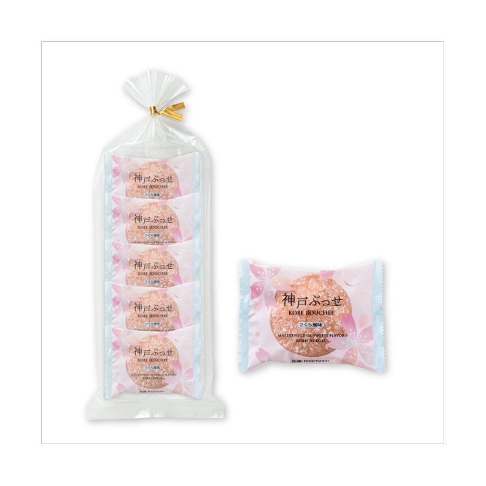 春を感じるふわっと軽い生地に、刻んだ桜の花びらとりんごの果肉が入ったクリームをサンドしました。期間限定の神戸ぶっせです。