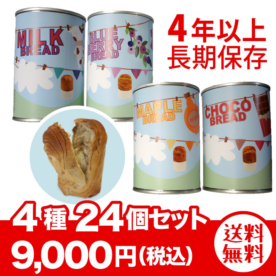 長期保存缶詰パン(送料無料 ※沖縄離島除く)つなぐパン 4種計24個ミルク・ブルーベリー・メイプル・チョコ 青空製パン 災害対策 非常食