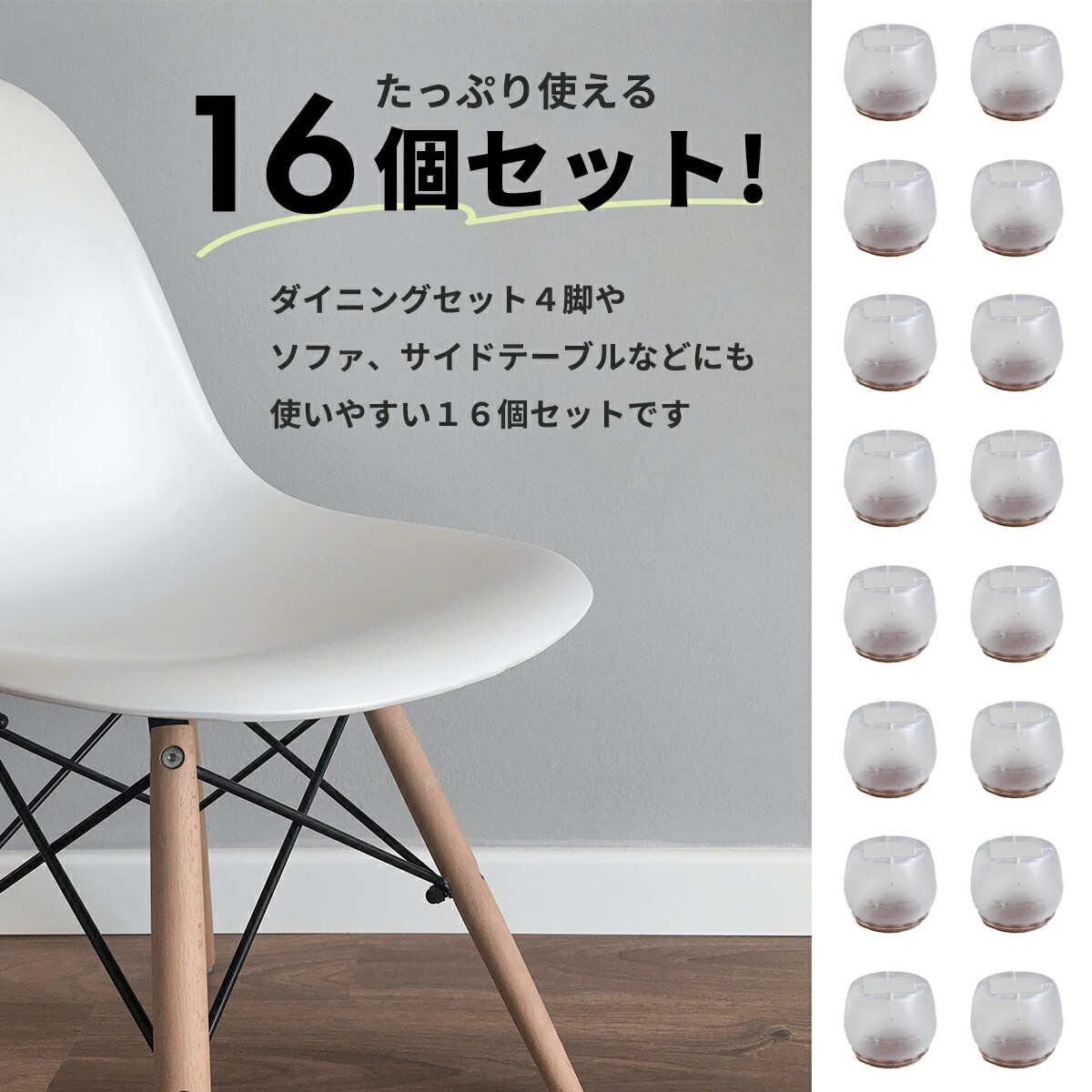 自由に使えるお得な16個セット!ダイニングチェア4脚分のほか、ソファ、サイドテーブルなどの傷防止に。