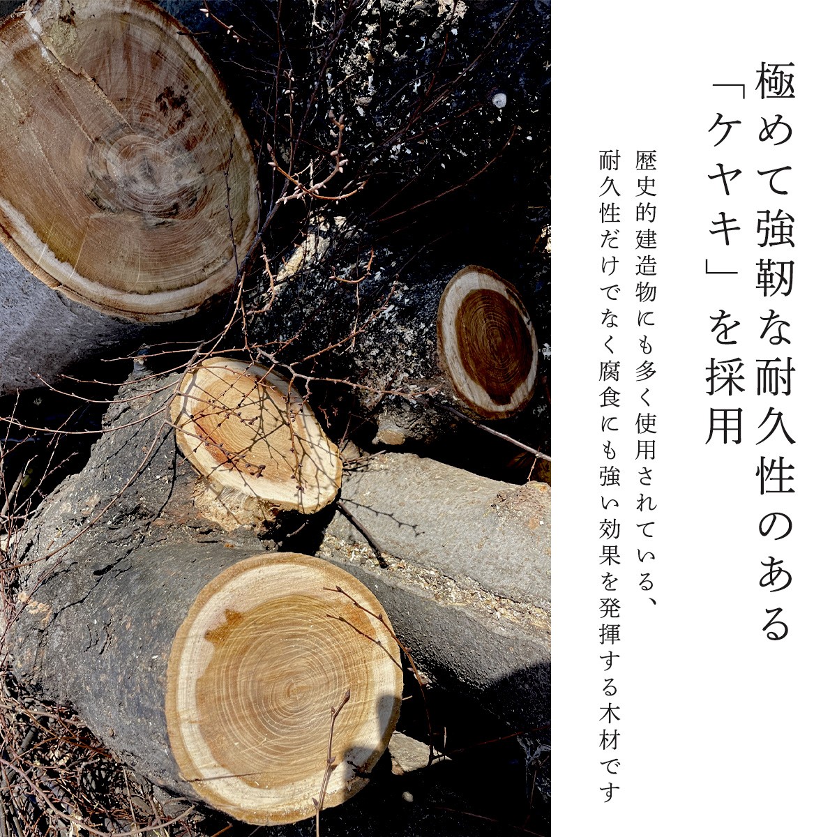 原材料としては極めて強靭な耐久性のある「ケヤキ」を採用。歴史的建造物にも多く採用されており、腐食にも強い木材です。