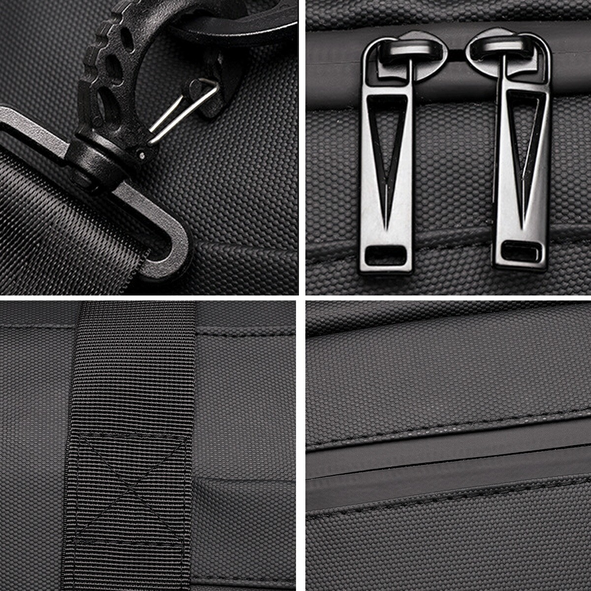 外側3か所のファスナーポケット+シューズポケット。内側には乾湿ポケット付き。