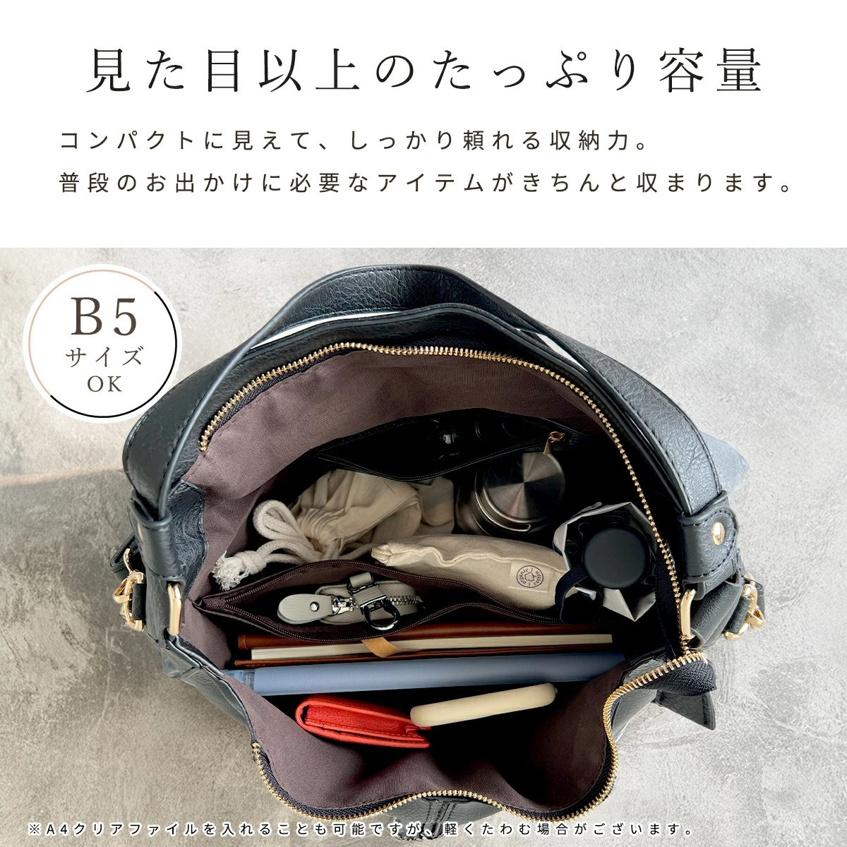 外ポケットや内側の仕切りポケットで収納力も抜群。B5サイズのファイルやiPadが入り、通勤やお出かけに最適。