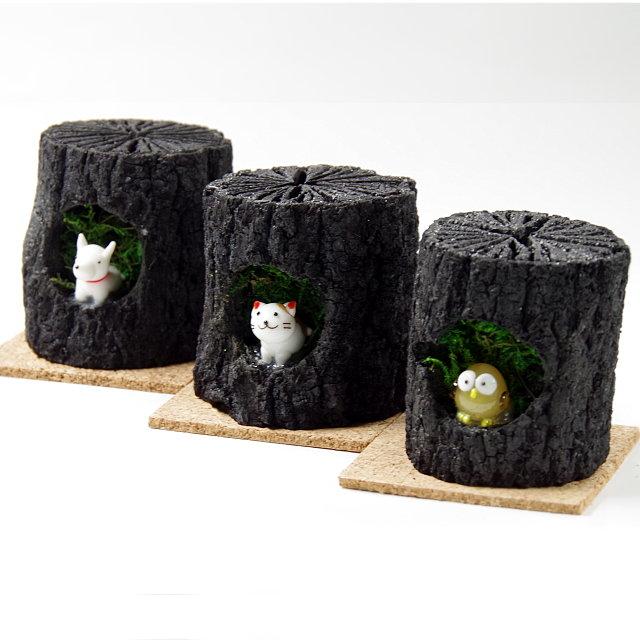 フクロウやイヌ、ネコといったかわいらしい動物たちがくぬぎ炭の中に棲んでいます。