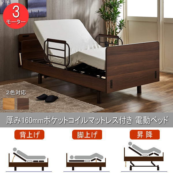 電動ベッド 介護ベッド 介護用ベッド ポケットコイルマットレス付き 3モーター 電動リクライニングベッド 昇降 シングルベッド リモコン 床面高さ調節 手すり