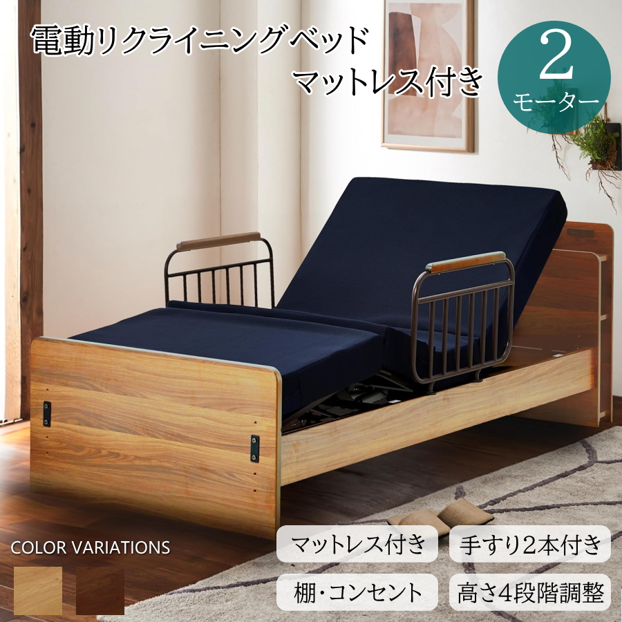 電動ベッド 介護ベッド 介護用ベッド 2モーター 電動リクライニングベッド シングルベッド マットレス付き リモコン操作 床面高さ調節 手すり 棚 コンセント