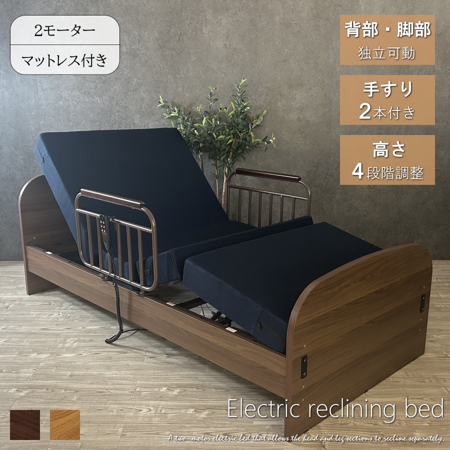 電動ベッド 介護ベッド 介護用ベッド マットレス付き 2モーター 電動リクライニングベッド シングルベッド リモコン操作 床面高さ調節 手すり 電動 介護