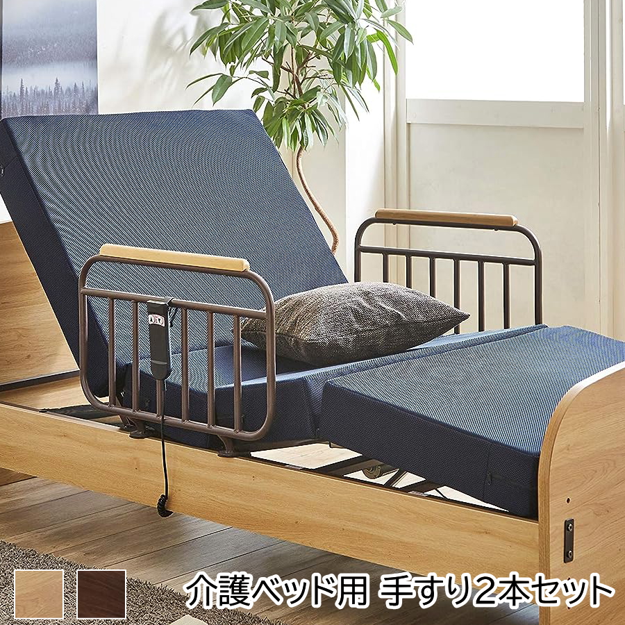 介護ベッド用 電動ベッド用 手すり 手摺り 2本セット 2本組 サイドガード 転落防止 柵 介護用ベッド 天然木 木製 スチール ナチュラル ブラウン