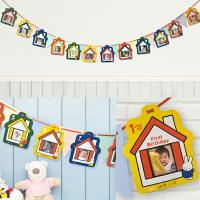 生まれてから1か月ごとに1歳までの写真を入れて、付属のリボンに旗と一緒に通せばオリジナルのガーランドが作れます。