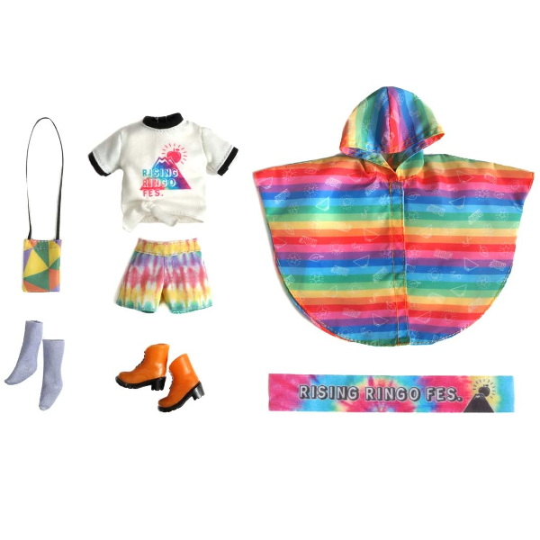 Tシャツ(1)、ショートパンツ(1)、ソックス(1)、レインポンチョ(1)、フェイスタオル(1)、クツ(1)、サコッシュ(1)、※人形は別売です