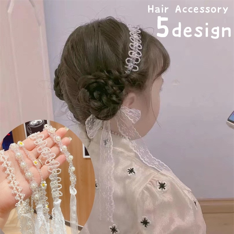 カチューシャ リボン付き ヘッドドレス 子供 キッズ ジュニア 女の子 ヘアアクセサリー 髪飾り ロングリボン レースリボン フェイクパール ラインス