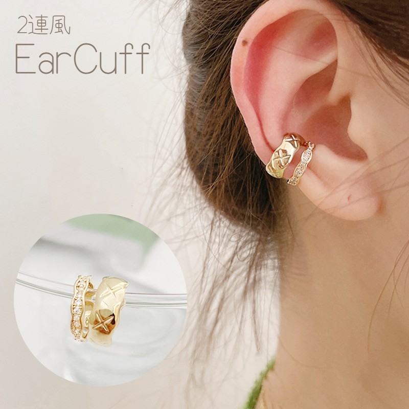 イヤーカフ イヤークリップ 片耳用 単品 重ね付け風 2連 レディース 女性 アクセサリー 幅広 ラインストーン キラキラ 華やか ゴールドカラー お