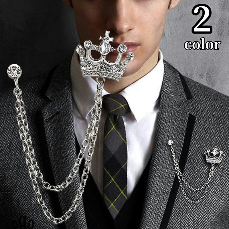 ラペルピン メンズ レディース 男女兼用 ピンブローチ ピンバッチ 王冠 クラウン チェーン ラインストーン おしゃれ かっこいい きれいめ 大人上品