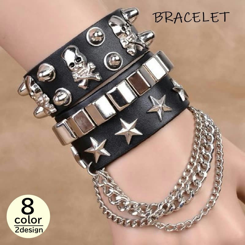 ブレスレット 腕輪 男女兼用 ユニセックス メンズ 男性 レディース 女性 アクセサリー レザー調 幅広 ドクロ 星 チェーン スタッズ 鈴付き おし
