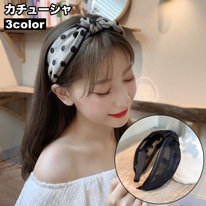 カチューシャ 幅広 レディース ヘアアクセサリー 髪飾り 髪留め ヘアアレンジ 結び目 レース メッシュ 透け感 水玉 ドット 女性用 可愛い おしゃ