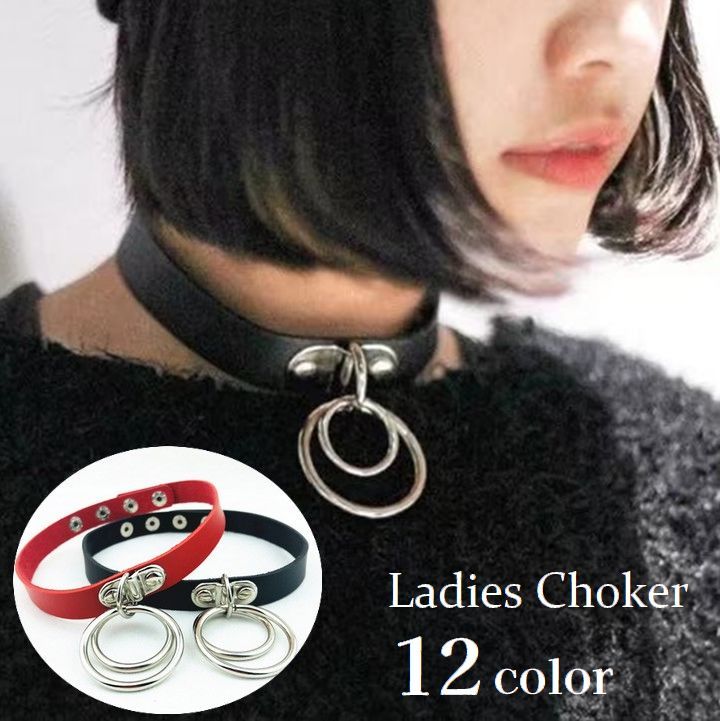 チョーカー 首飾り レディース ネックレス アクセサリー レザー調 フェイクレザー ダブルリング サークル型 女性用 婦人用 幅広 おしゃれ パンク
