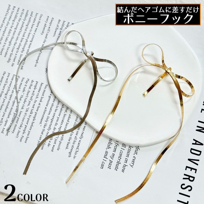 ポニーフック ヘアカフ レディース ヘアアクセサリー 髪留め 髪飾り メタル リボン 大きめロング スネークチェーン 結び目隠し