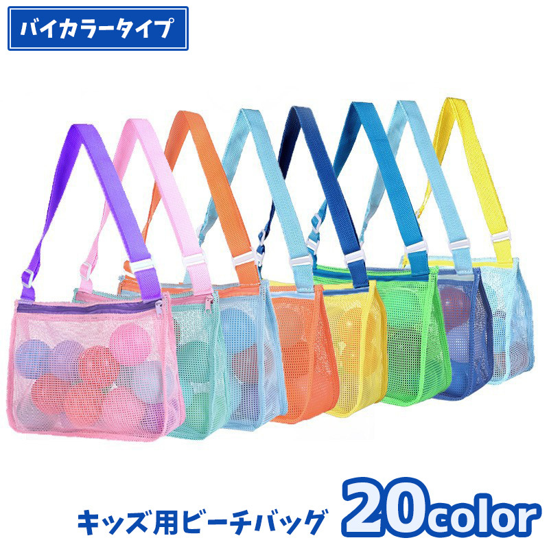 ビーチバッグ メッシュバッグ プールバッグ バイカラー キッズ 子ども用 ショルダーバッグ 鞄 カバン おもちゃ入れ ファスナー 網目 海 砂場 かわ