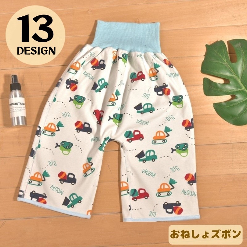 車や動物の総柄プリントがかわいい子供用おねしょズボンです。