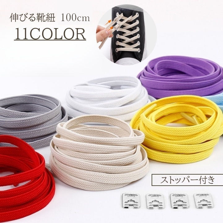 靴紐 100cm 靴ひも ゴム紐 弾性 レディース メンズ 平紐 カラバリ豊富 かわいい おしゃれ バックル付き ストッパー付き 結ばない シューレー