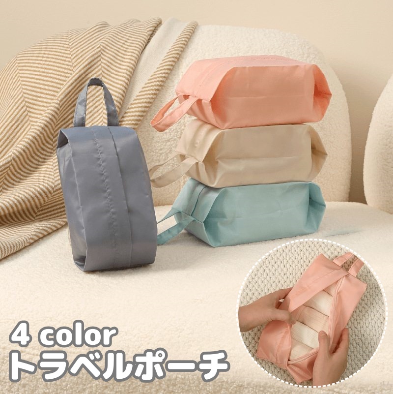 旅行中に便利な持ち手付きのトラベルポーチです。