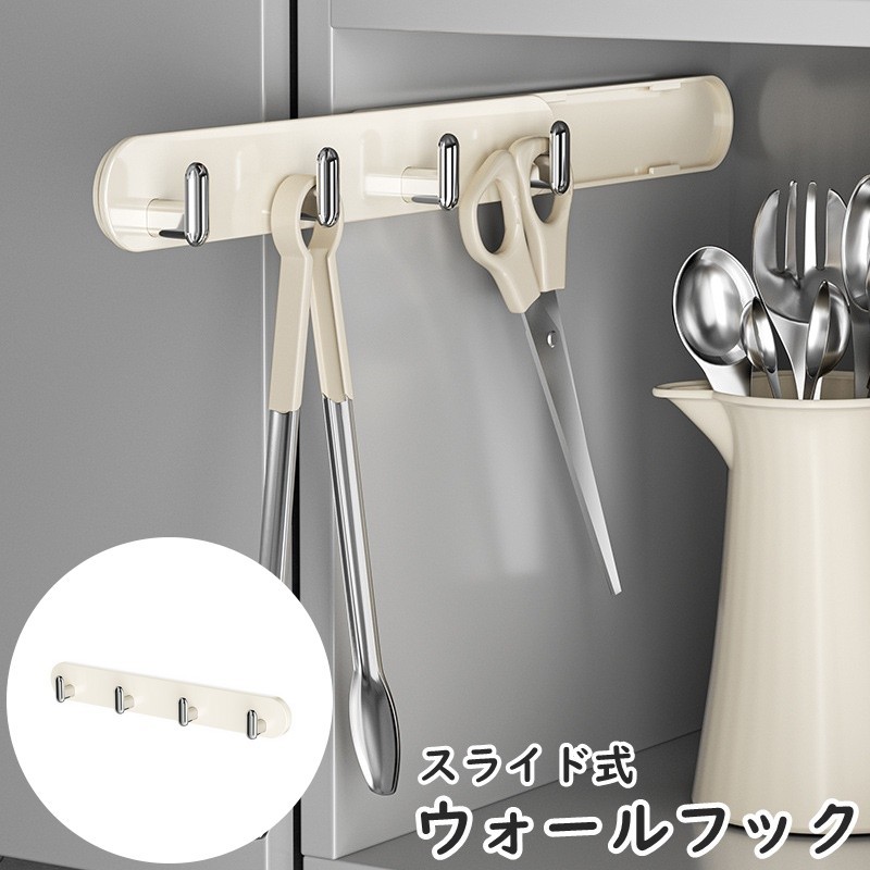 ウォールフック スライド式 粘着フック コートハンガー 壁掛けフック 4連 伸縮可能 隙間収納 ウォールハンガー 帽子掛け 鞄掛け 壁面収納 収納用品