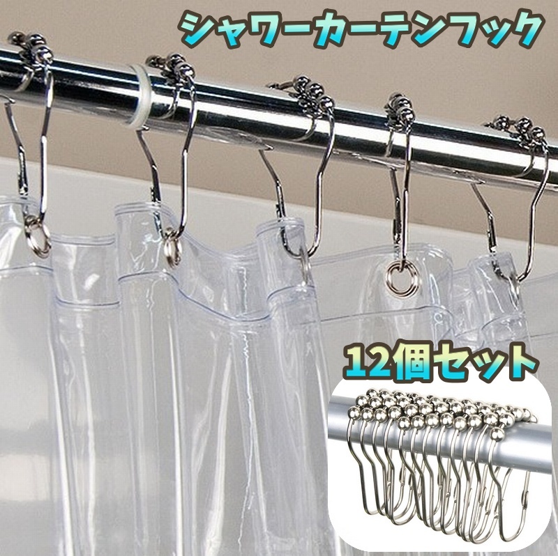 シャワーカーテンフック 12個セット カーテンフック カーテンリング ボール付き 滑りやすい スムーズ 浴室 シャワールーム バスルーム