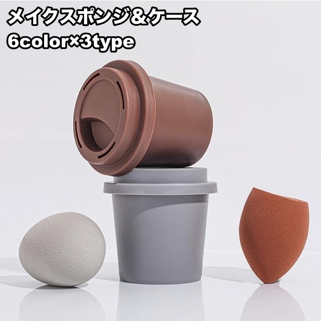 メイクスポンジ パフ ケース付き コーヒーカップ型 収納 メイク道具 立体 カット 斜め ひょうたん型 ドロップ型 ファンデーション リキッド パウダ