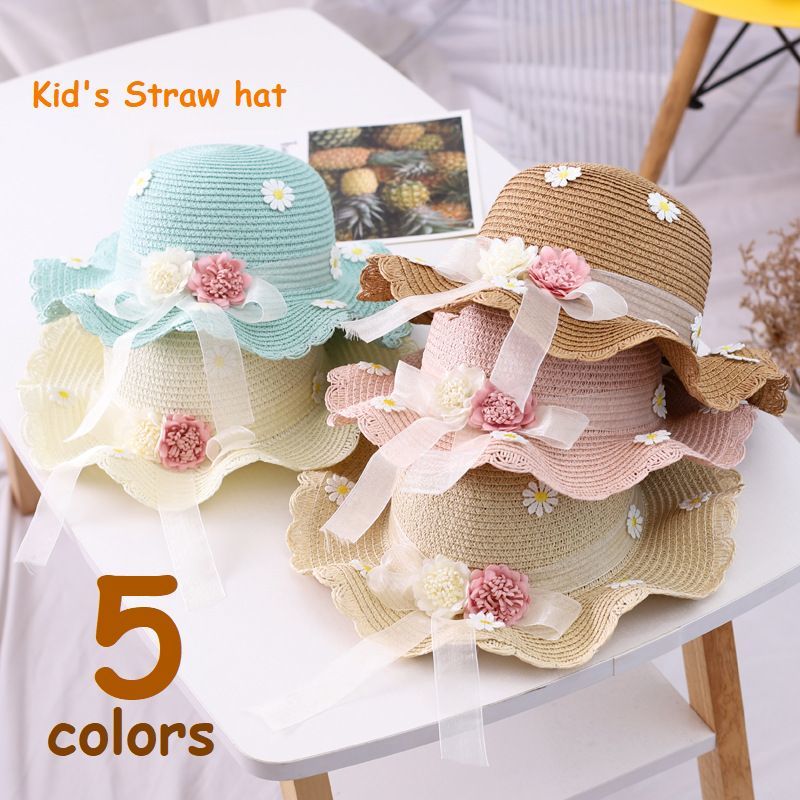 子供用 麦わら帽子 ストローハット キッズ 女の子 フラワー コサージュ リボン 紫外線対策 日よけ 日焼け予防 女児 可愛い ピンク ベージュ クリ
