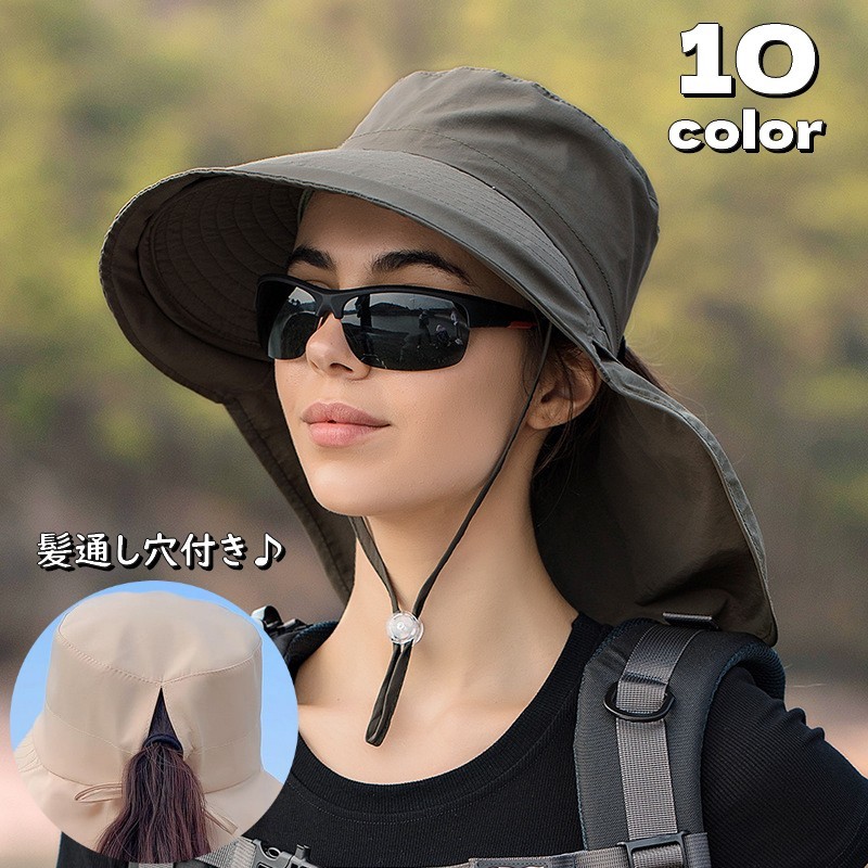 サファリハット 帽子 ネックカバー付き レディース 女性用 つば広 あご紐付き ネックガード ぼうし 髪通し穴付き 日除け 日焼け対策 紫外線対策 U