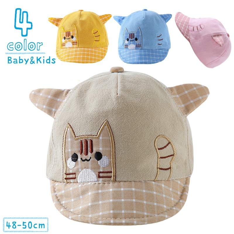 キャップ 帽子 ベビー 子供用 キッズ 男の子 女の子 赤ちゃん ぼうし ベースボールキャップ つば付き 猫 チェック 耳付き 格子柄 ネコ 刺繍 キ