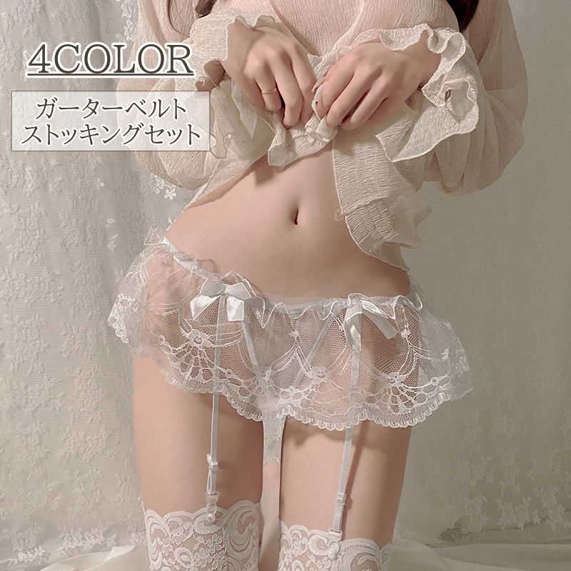 ガーターベルト 2点セット ストッキング ガーターストッキング レディース ショーツ 一体型 レース リボン セクシーランジェリー かわいい おしゃれ