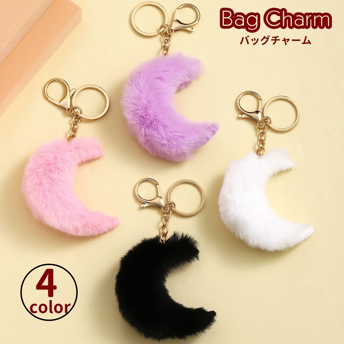 ふわふわのフェイクファーに三日月モチーフをあしらった、可愛らしいバッグチャームです。