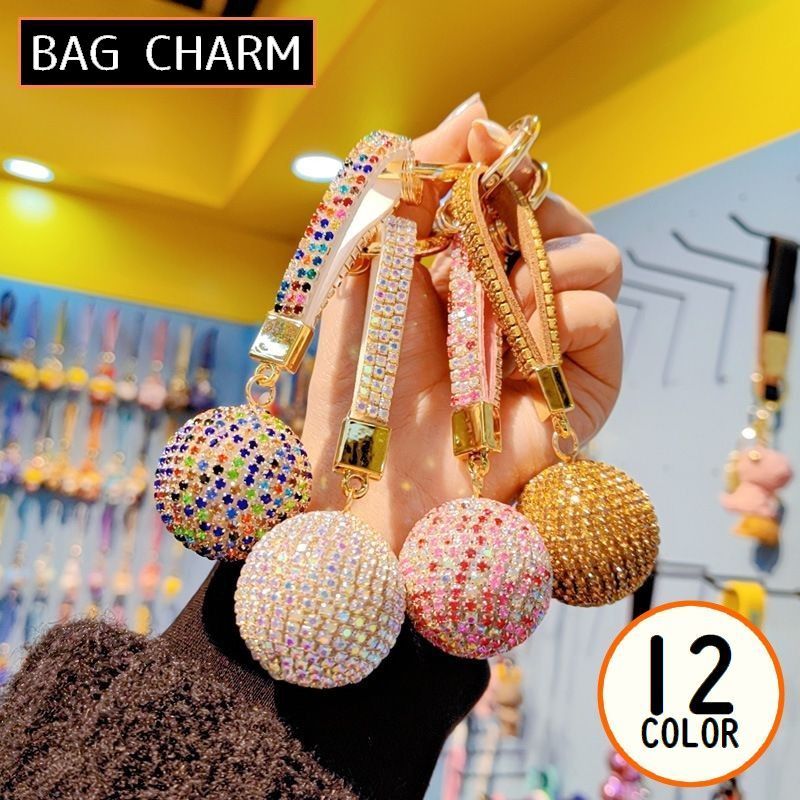 バッグチャーム キーホルダー キーリング レディース 大きめ ボール 球 玉 ラインストーン キラキラ ストラップ 丸型カラビナ付き