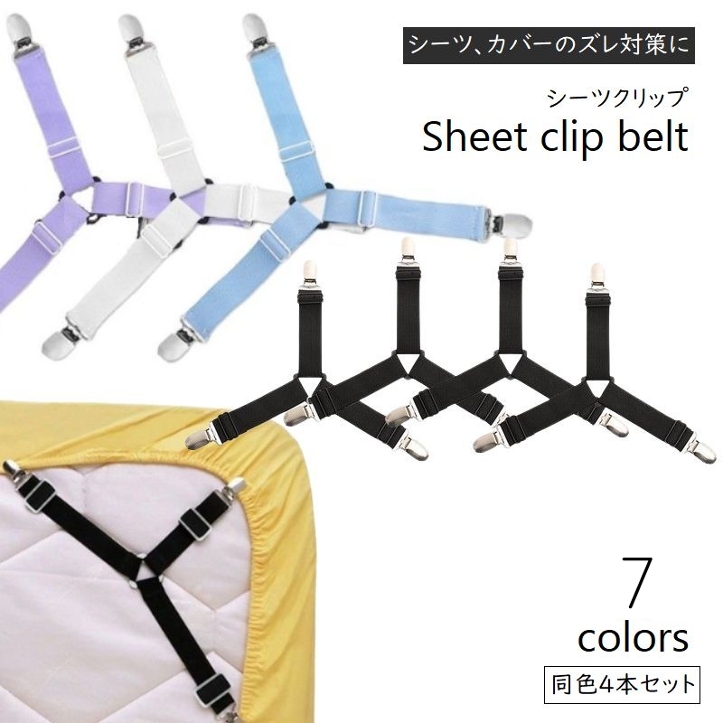 ベッドシーツクリップ 4本セット ズレ防止 3ヶ所留め シーツ固定 長さ調節可 バンド ベルト コーナー留め ボックスシーツ マットレス 敷布団 敷パ