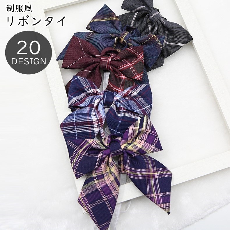 リボンタイ 蝶ネクタイ スクールリボン レディース 女性 ファッション雑貨 制服風 学園風 学生風 総柄 チェック ネイビー ピンク ブルー イエロー