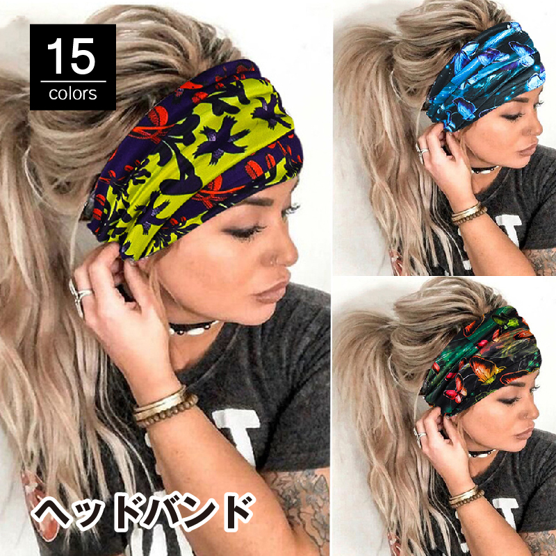 ヘッドバンド ヘアバンド ターバン レディース メンズ 男女兼用 ファッション小物 ヘアアクセサリー 柄物 プリント 幅広 スポーツ 汗止め 蝶 オル