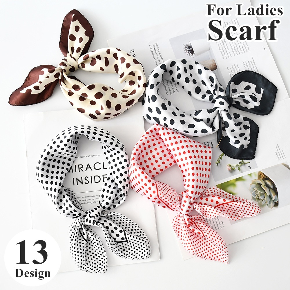 スカーフ 50cm レディース 女性 婦人 正方形 大判 襟元 バッグスカーフ ファッション小物 サテン風 ドット 水玉柄 ダルメシアン柄 リーフ フ