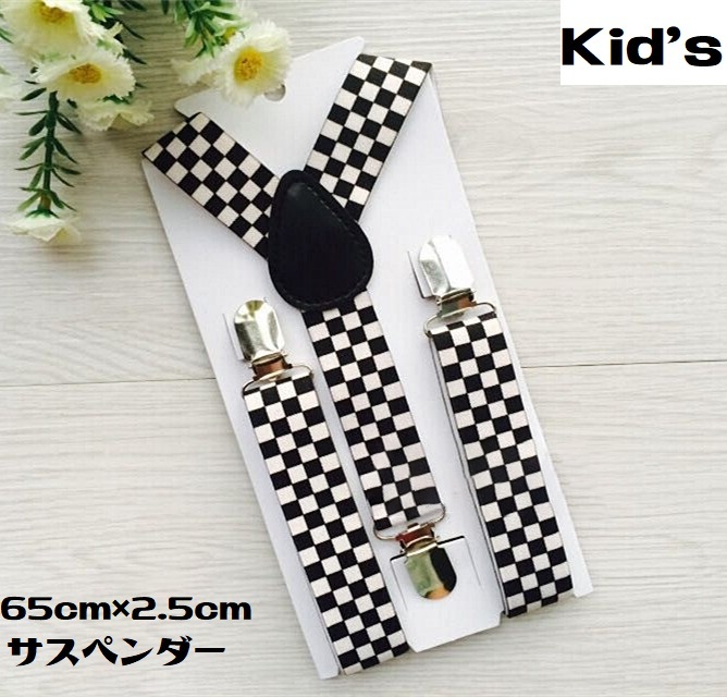 サスペンダー キッズ 男の子 女の子 ズボンストラップ チェック モノトーン ブラック ホワイト 3クリップ お洒落 65cm フォーマル プレゼント