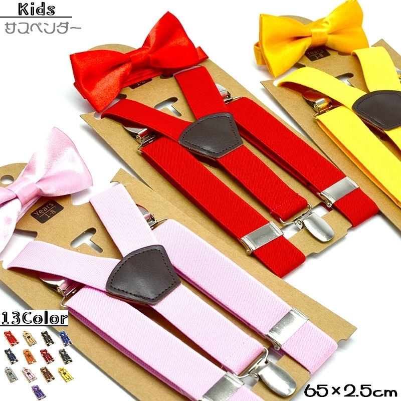 サスペンダー 2点セット キッズ 蝶ネクタイ付き 男の子 女の子 ズボンストラップ 3クリップ サイズ調整 シンプル 無地 おしゃれ かわいい 65c