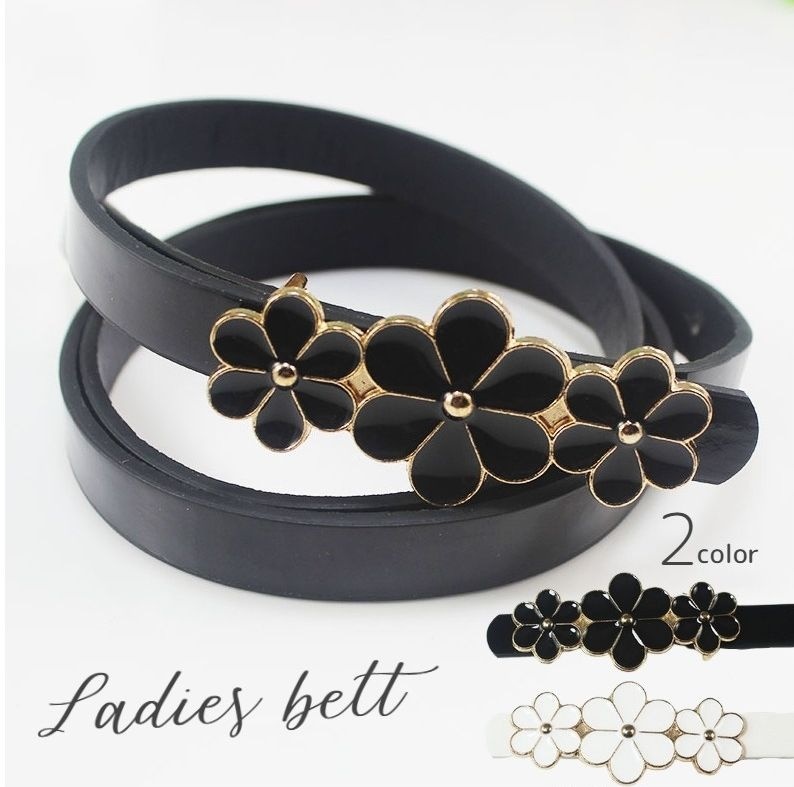 ベルト レディース 女性用 細ベルト 細め レザー調 ウエストマーク アクセント お花 フラワー カジュアル かわいい 大人可愛い おしゃれ 黒 ホワ