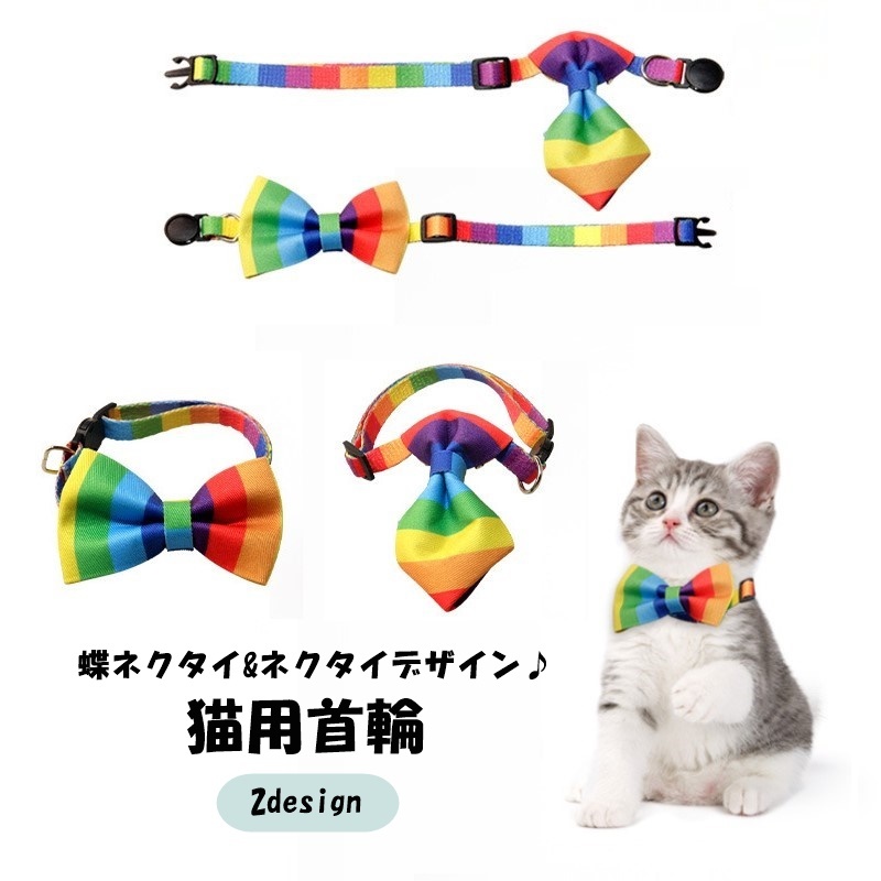 猫用首輪 カラー ねこ ネコ ペット用品 首飾り 蝶ネクタイ ネクタイ リボン セーフティーバックル レインボー 虹色 Dカン 調節可能 かわいい お