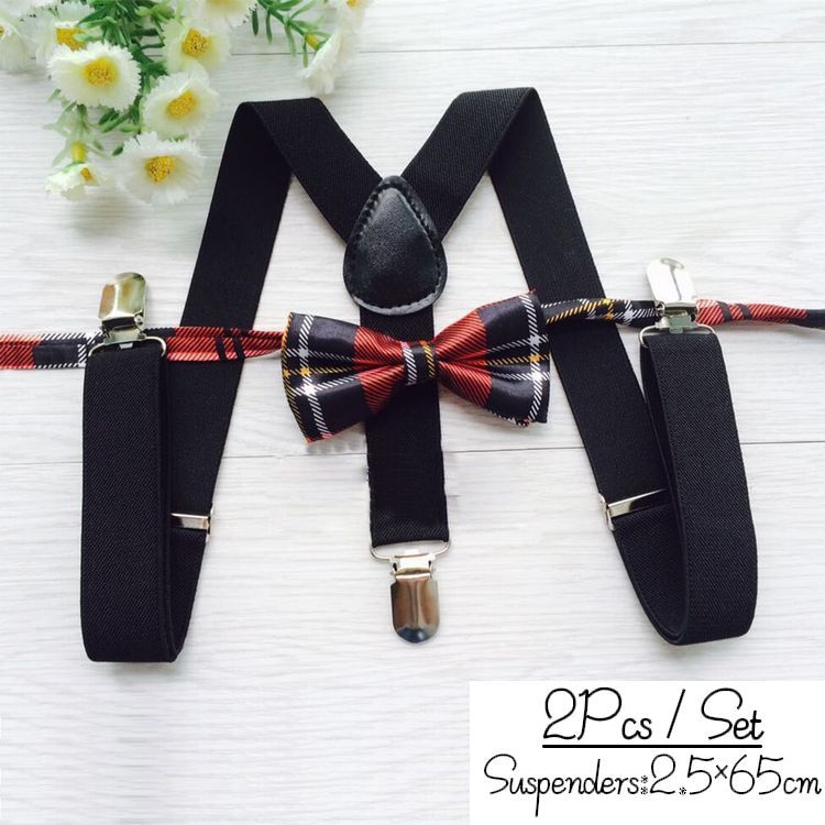 サスペンダー 蝶ネクタイ ボウタイ 吊りバンド Y型 キッズ 子供 男の子 女の子 ユニセックス 2点セット 長さ調節可 タータン チェック 定番 男
