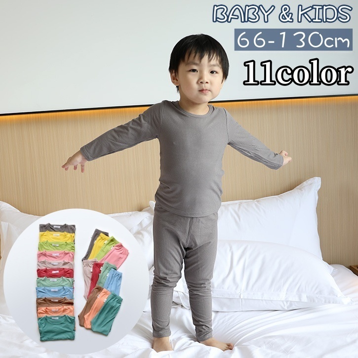 パジャマ ルームウェア インナー 上下 2点セット キッズ ベビー 子供 男の子 女の子 リブ 長袖 ロングTシャツ ロングパンツ ラウンドネック ウ
