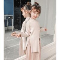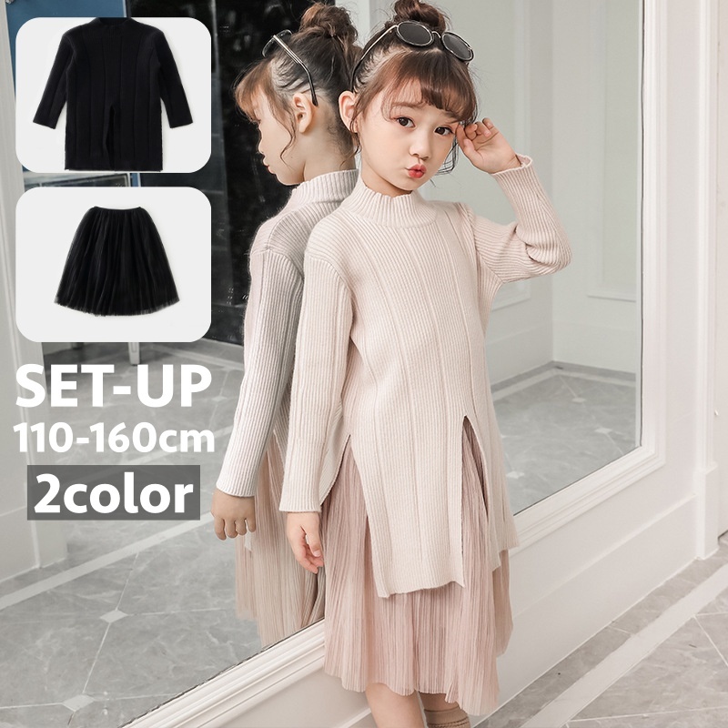 セットアップ 上下 2点セット キッズ ジュニア 子供 女の子 ガールズ リブニット セーター 長袖 ハイネック スリット スカート 膝丈 ウエストゴ