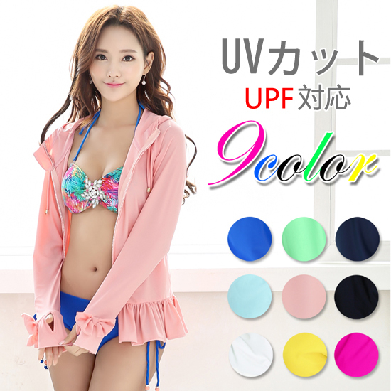 UVカットラッシュガード レディース UPF対応 フード付き 長袖 フリル 体型カバー