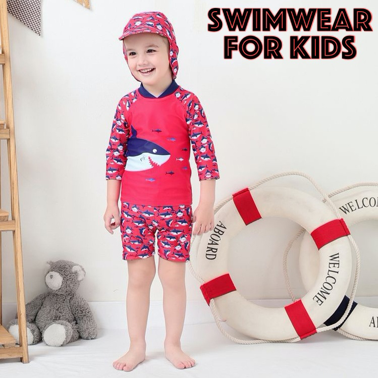 サメのイラストがかっこいい子供用の水着3点セット。